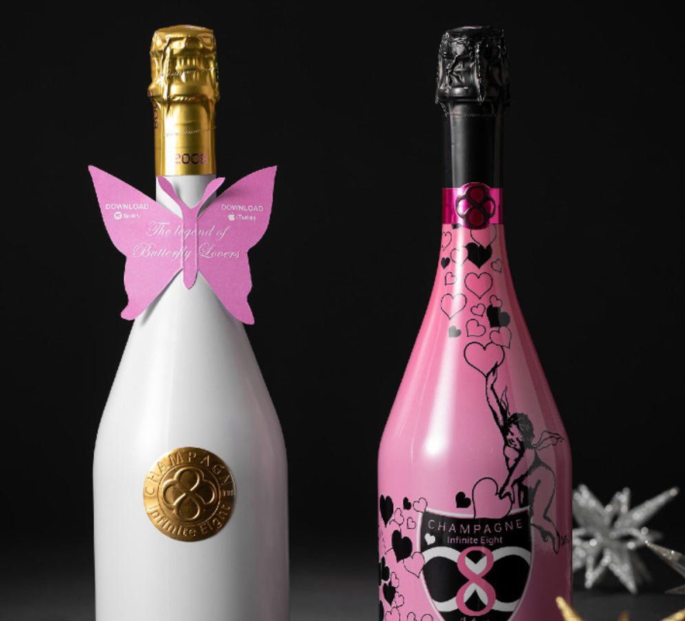 Champagne Infinite 8 fut la première Maison à proposer des bouteilles dont la totalité de la surface laisse apparaitre des motifs quand la température de dégustation est atteinte.